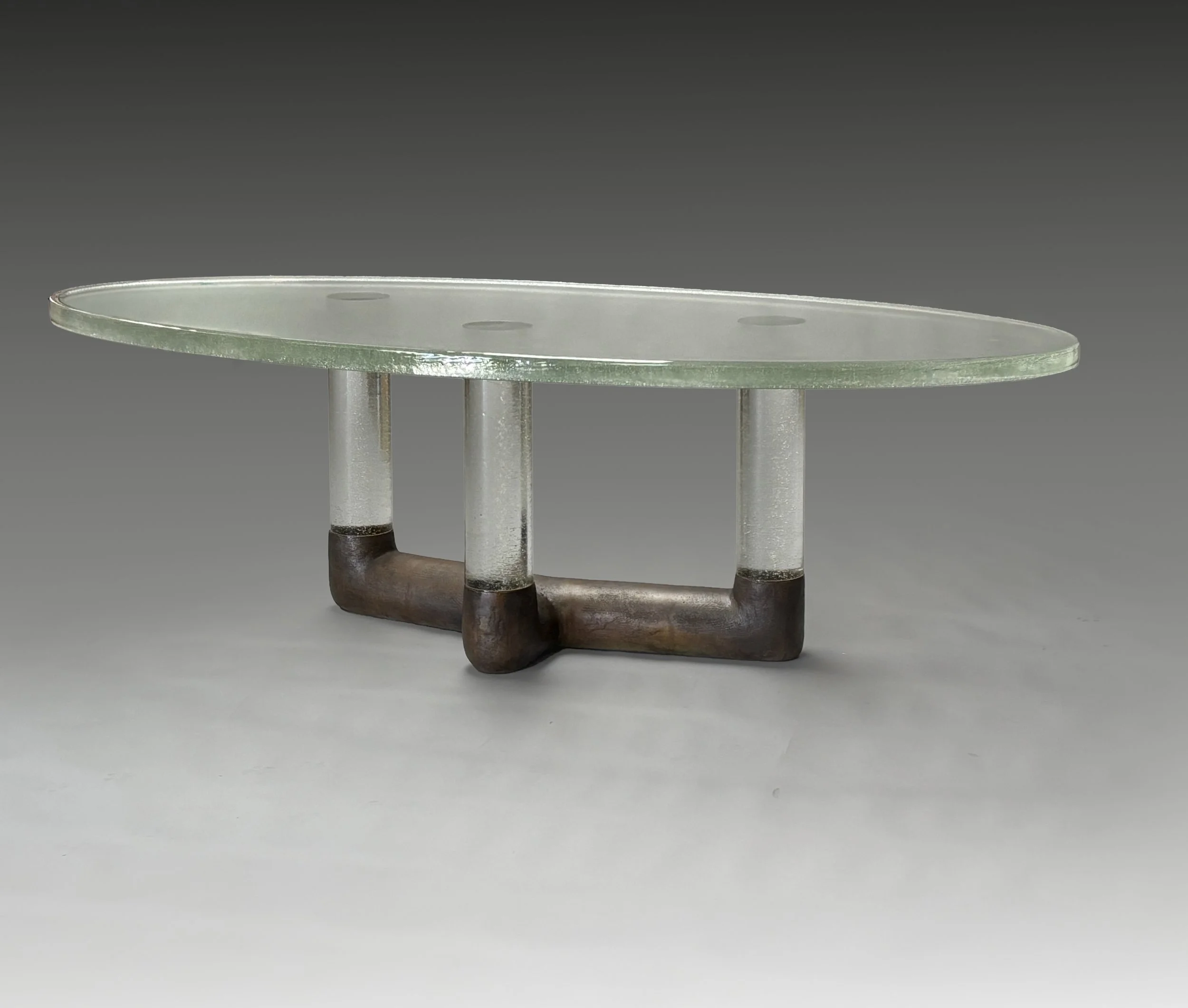 Dune Dining Table MATERIALSHand-Cast Glass and Brushed Stainless SteelDIMENSIONS96”L x 42”W (OVAL) x 30”HAvailable in custom sizes INQUIRE INQUIRE