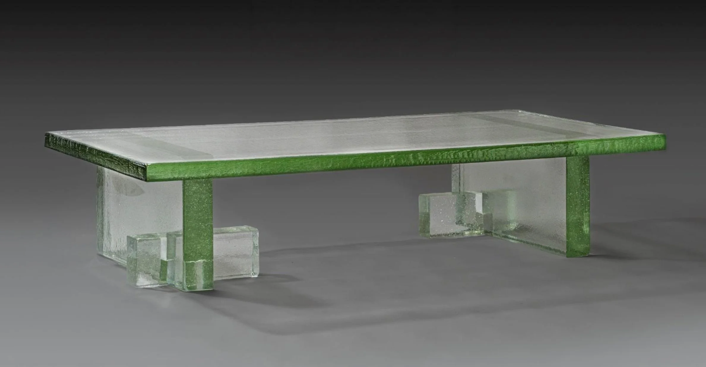 Solape Coffee Table MATERIALSSolid Hand-Cast Glass Top Two Solid Hand Cast, Cut, and Milled Table BasesDIMENSIONSGlass Table Top: 74" Length x 40" Width x 2" Thickness | Glass Bases: 32" Length x 16" Width x 4" Thickness INQUIRE INQUIRE
